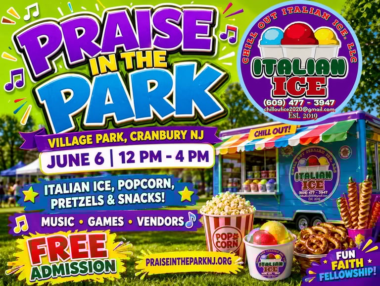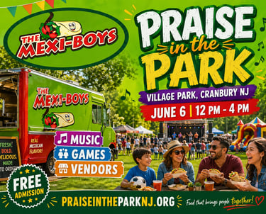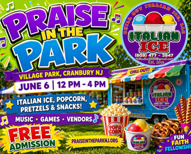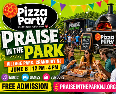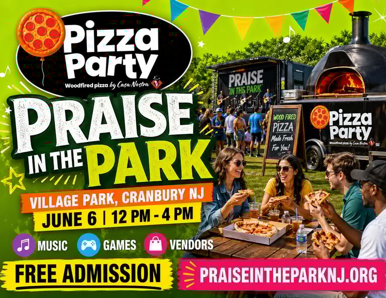 Don't miss Pizza Party, with delicious wood-fired stove pizza and more this year at Praise in the Park.Their mobile kitchen delivers Italian delights at lightning speed, letting you fuel up between sets while soaking in the electric atmosphere under the open sky. Enjoy a slice or three in Village Park, Cranbury, NJ